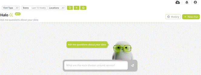 Halo has access to the last 12 weeks of data from your mystery guest audits, feedback, reviews and product ratings. Please use the filters to help specify the visit type and date range you'd like to review. Please note Halo cannot compare to locations you don't have permissions for and does not currently include competitor data.